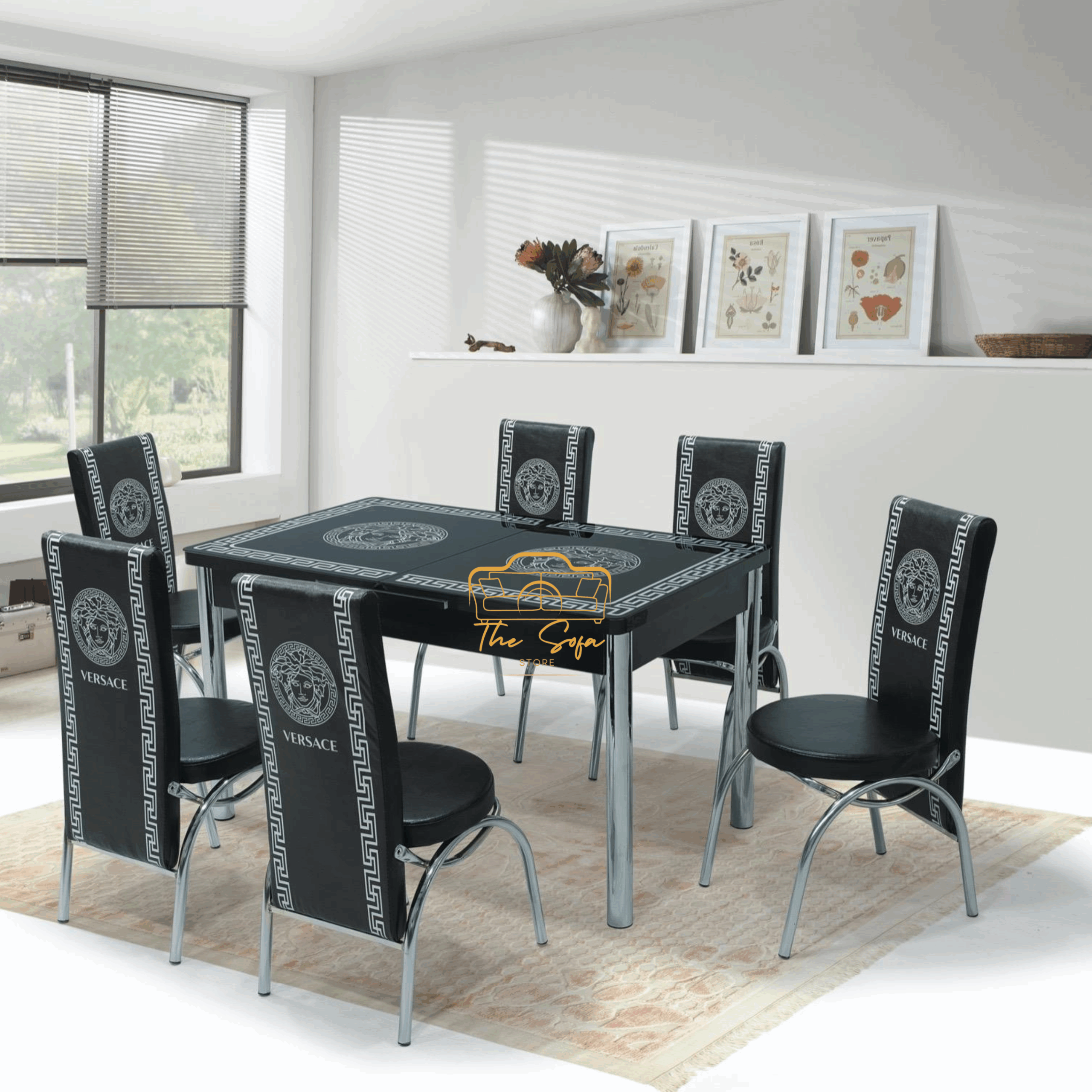 The Black Versace Glass Dining Table is a stunning mix of luxury and modern elegance. Characteristic of a smooth temporary black glass top with iconic vsches-inspired detailing, this dining table adds a sophisticated touch to any dining room. Its durable stainless steel base ensures stability by increasing contemporary design. Complete size for a seat of 4 to 6 people, this table is ideal for stylish meetings and everyday food. Black Versace Glass to elevate your location with a timeless appeal of the dining table. Welcome to The Sofa Store Website