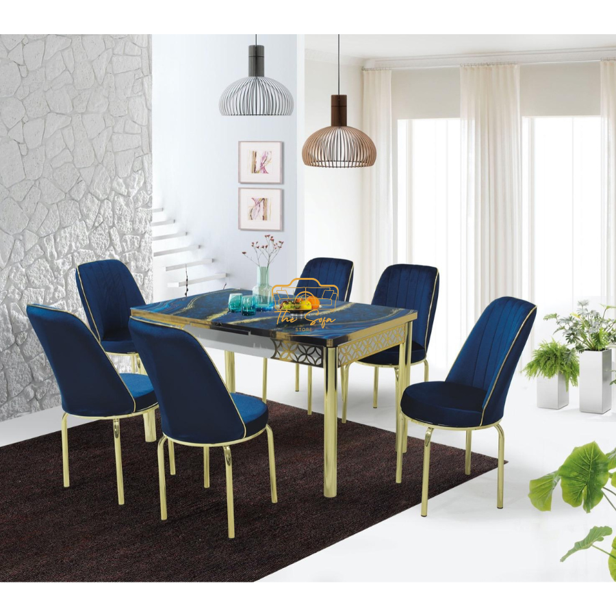 Add a touch of luxury and modern elegance to your dining place with a blue gold glass table with 6 chairs. A striking blue-colored temporary glass tabletop and a bold gold-finished base are characterized, this food set is designed to stand out. Its sophisticated color combinations and smooth lines make it an ideal focal point for contemporary homes that appreciate both the function and the style. This set includes six ergonomically designed chairs that mix comfort with high-end design. Each chair supplemented the table beautifully, providing a comfortable seating experience for dinner or entertaining guests of each chair family, supported by softened, durable materials, supported by upholstery and strong frames. Keeping in mind the quality and durability, blue gold glass table with 6 chairs does not only look impressive, but it is also easy to maintain. Whether you are styling a formal dining room or upgrading your open-plun living area, this set offers an ideal mix of elegance, practicality and permanent appeal .Discover Comfort at The Sofa Store Website