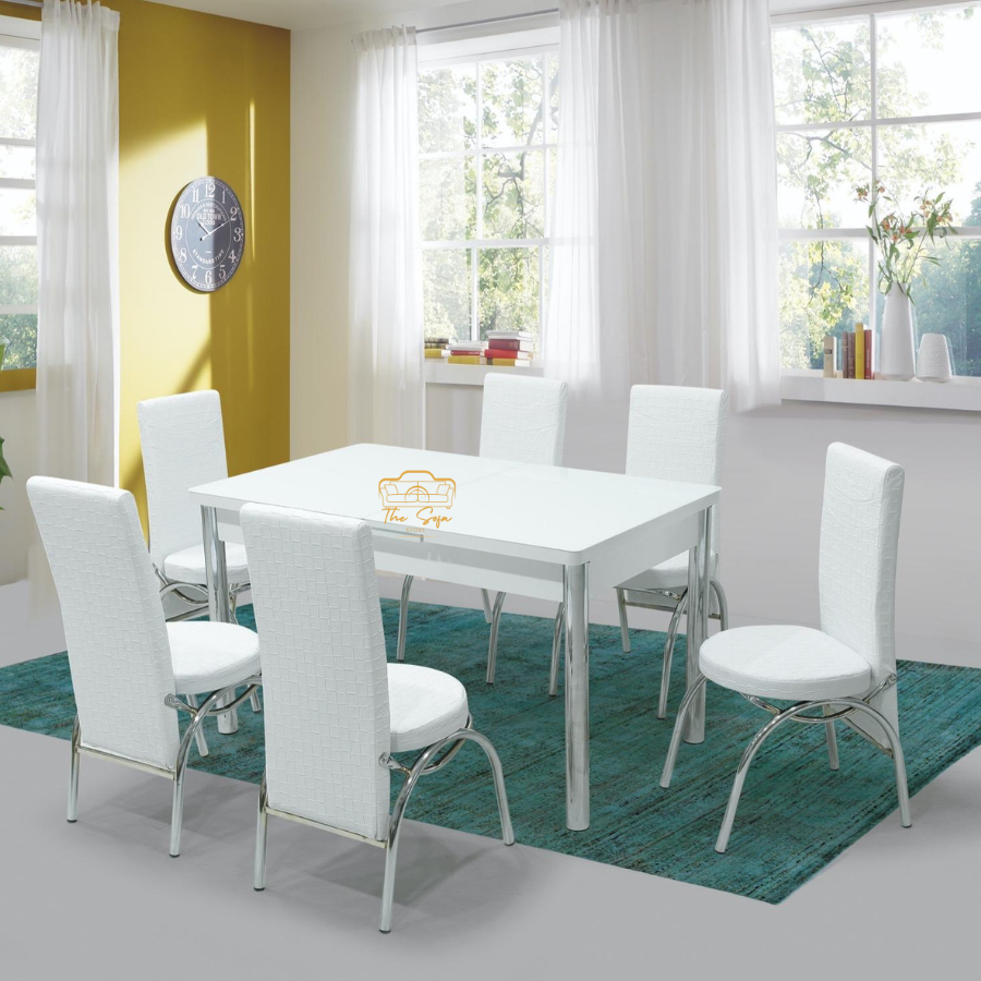 Brighten your dining space with elegant full white glass table with 6 chairs. The ancient white tempered glass tabletop provides a smooth, modern look that immediately feels a fresh, clean in any room. Combined with a strong frame and six matching chairs, this set creates a stylish and functional centralpeeth for contemporary life.Each chair is designed for comfort and durability, which is upholstered in materials that complement bright white tables. Made to maintain final and easier, this dining set is suitable for a variety of interior styles – from minimum to modern chic – it makes it ideal for everyday food or specialized ceremonies. Whether you are updating your dining room or presenting a new house, full white glass table with 6 chairs brings together simplicity and sophistication, transforms your location into a welcome and stylish environment. Discover Comfort at The Sofa Store Website